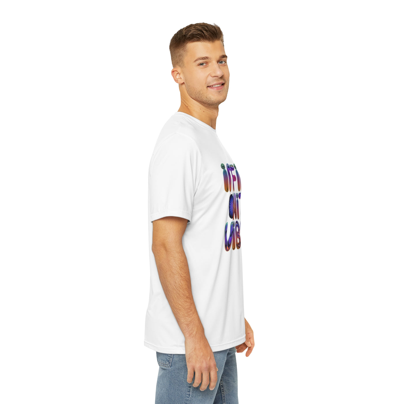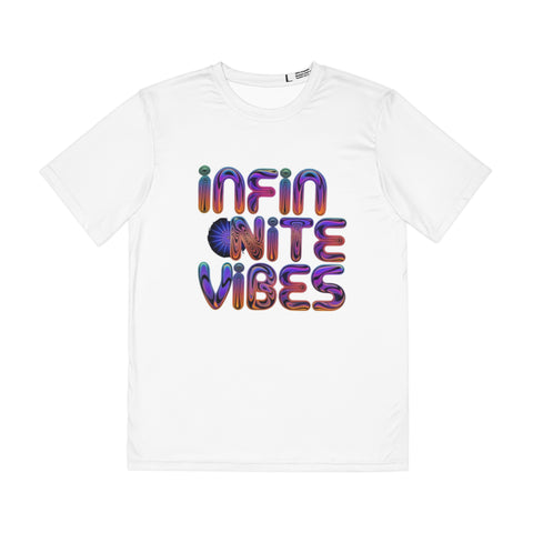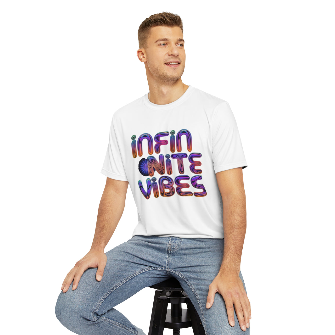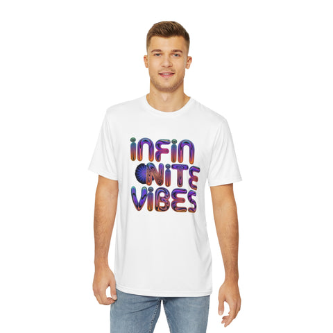 "Infinite Vibe" Psychedelic Men's Polyester Tee (AOP) T-Shirt | Trippy Text Design | Retro Hippie Festival Tee Sale